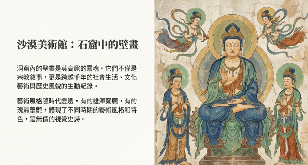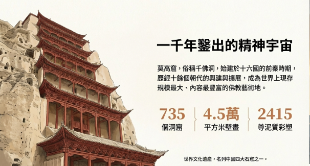 【莫高窟】坐落於河西走廊的西部盡頭的敦煌。它的開鑿從十六國時期至元代,前後延續約1000年,這在中國石窟中絕無僅有。它既是中國古代文明的一個璀璨的藝術寶庫,也是古代絲綢之路上曾經發生過的不同文明之間對話和交流的重要見證。莫高窟現有洞窟735個,保存壁畫4.5萬多平方米,彩塑2400余尊,唐宋木構窟簷5座,是中國石窟藝術發展演變的一個縮影,在石窟藝術中享有崇高的歷史地位。窟內繪、塑佛像及佛典內容,為佛徒修行、觀像、禮拜處所。敦煌石窟是建築、雕塑、壁畫三者結合的立體藝術。洞窟分南北兩區:南區492個洞窟是莫高窟禮佛活動的場所,北區243個洞窟主要是僧人和工匠的居住地,內有修行和生活設施土炕坑、煙道、壁龕、燈檯等,但多無彩塑和壁畫。敦煌石窟一名通常用以指莫高窟,是莫高窟、西千佛洞的總稱,有時也包括安西的榆林窟。敦煌石窟與山西大同雲岡石窟、河南洛陽龍門石窟並稱中國三大石窟。1961年中國國務院公佈莫高窟、榆林窟為中國重點文物保護單位。1987年,莫高窟作為文化遺產被列入《世界遺產名錄》。