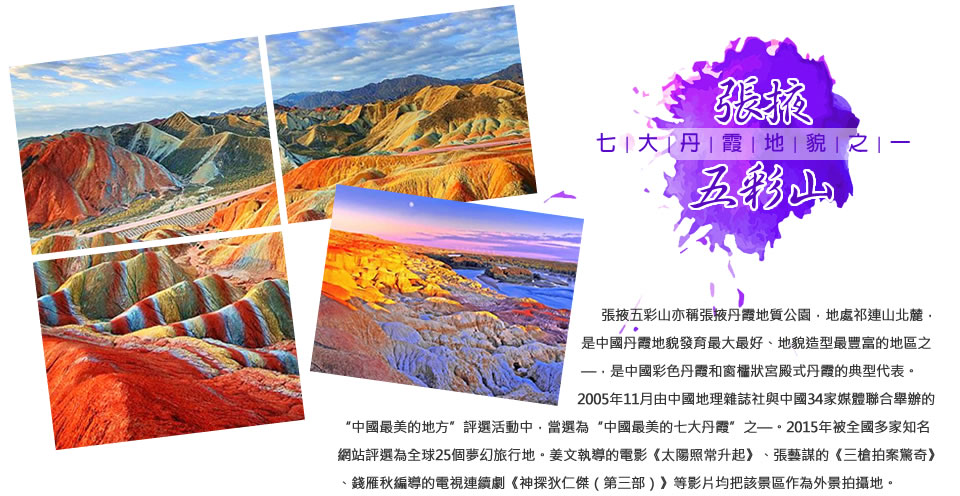 【七彩丹霞景區】國家5A級旅遊景區,位於甘肅省張掖市臨澤縣、肅南縣境內,景區總面積50平方公里,具有較高的旅遊觀賞價值和地質科考價值。張掖七彩丹霞是中國北方乾旱地區發育最典型的丹霞地貌,是國內唯一的丹霞地貌與彩色丘陵景觀高度複合區,色彩繽紛、觀賞性強、面積大,集雄、險、奇、幽、美於一身。七彩丹霞景區為國家5A級旅遊景區、世界地質公園,是“中國最美的七大丹霞”“奇險靈秀美如畫——中國最美的六處奇異地貌”“世界十大神奇地理奇觀”之一,第三屆世界會長大會推選2023年首選旅遊目的地。