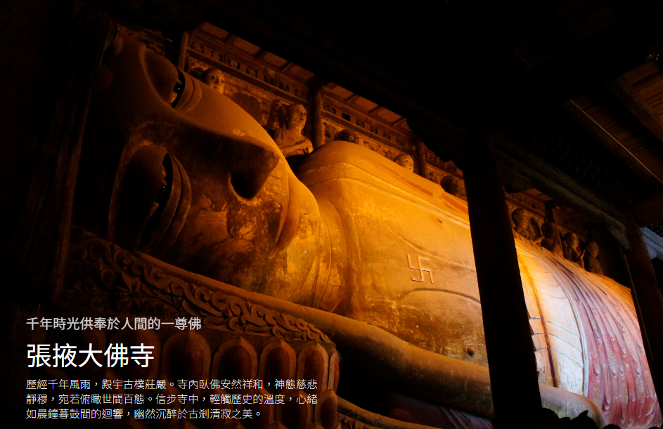 原名迦葉如來寺,因寺內供奉釋迦牟尼涅槃像,又名“臥佛寺”,為歷代皇室敕建的寺院,是絲綢之路上的一處重要名勝古蹟羣,也是歷史文化名城金張掖的標誌性建築。