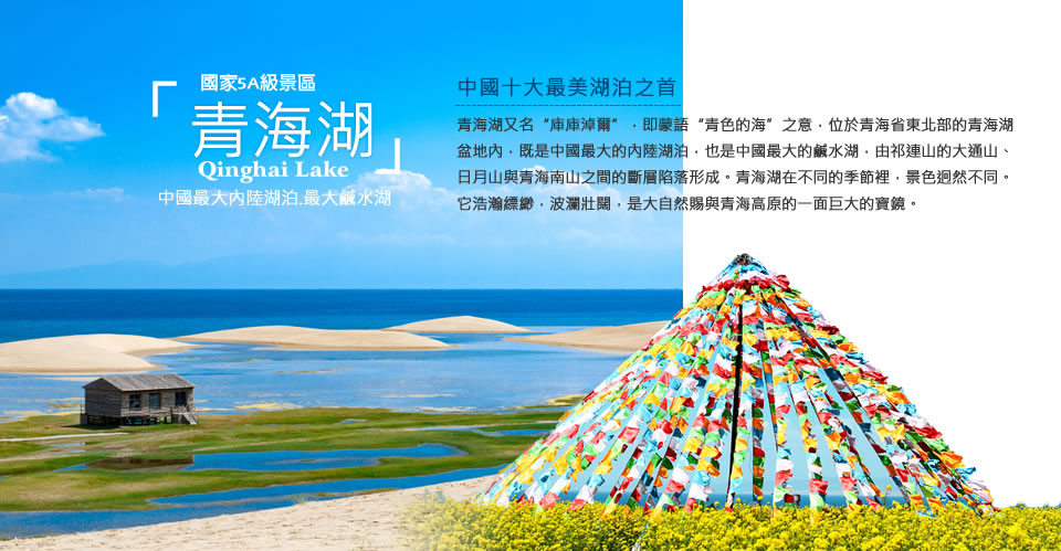 中國最大的內陸湖泊,古代稱為“西海”,藏語又叫做“錯溫波”,意為“青色的湖”;蒙古語稱她為“庫庫諾爾”,即“藍色的海洋”;景區總面積8,978平方公里,環湖周長為360公里,湖水平均深17.8公尺,湖面海拔為3,200公尺,其中水體面積約4,300平方公里。由於這裡地勢高,氣候十分涼爽,即便是烈日炎炎的盛夏,日平均氣溫也只有攝氏15度左右,是理想的避暑消夏的聖地。青海湖這裡地域遼闊、草原廣袤、河流眾多、水草豐美、環境幽靜,是大自然賜予青藏高原的一面巨大的寶鏡,被《中國國家地理雜誌》評為“中國最美五大湖”之首。