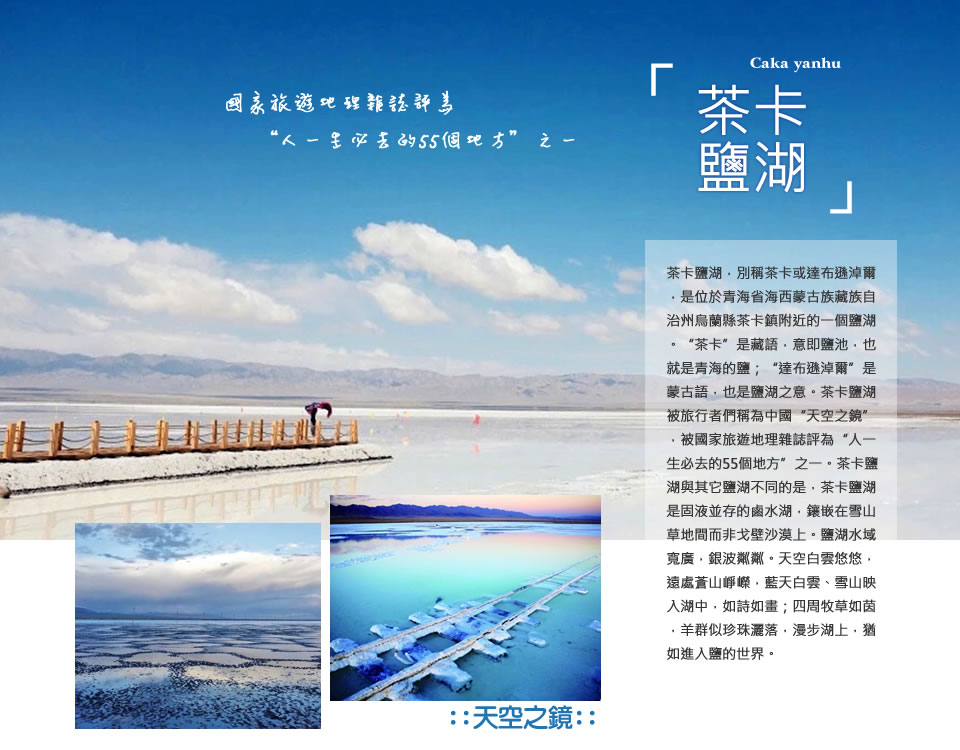 別稱茶卡或達布遜淖爾,是位於青海省海西蒙古族藏族自治州烏蘭縣茶卡鎮的天然結晶鹽湖,是柴達木盆地四大鹽湖之一。“茶卡”是藏語,意即鹽池,也就是青海的鹽;“達布遜淖爾”是蒙古語,也是鹽湖之意。茶卡鹽湖,號稱中國版的天空之鏡,媲美南美洲玻利維亞的烏尤尼鹽湖(Salar de Uyuni),茶卡鹽湖被《國家旅遊地理雜誌》評為「人一生必去的55個地方之一」。這裡的時間仿佛靜止了,給了每一個人一場純淨的夢,日落西山,夕陽的餘暉便散落在這白色的卷軸之上。假如到了青海湖,那就走得更遠一些,順道看看茶卡鹽湖,不要留下任何遺憾。